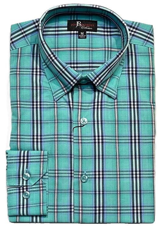 Trend by Fusion Long Sleeve Dark Teal Plaid Stretch Sport Shirt